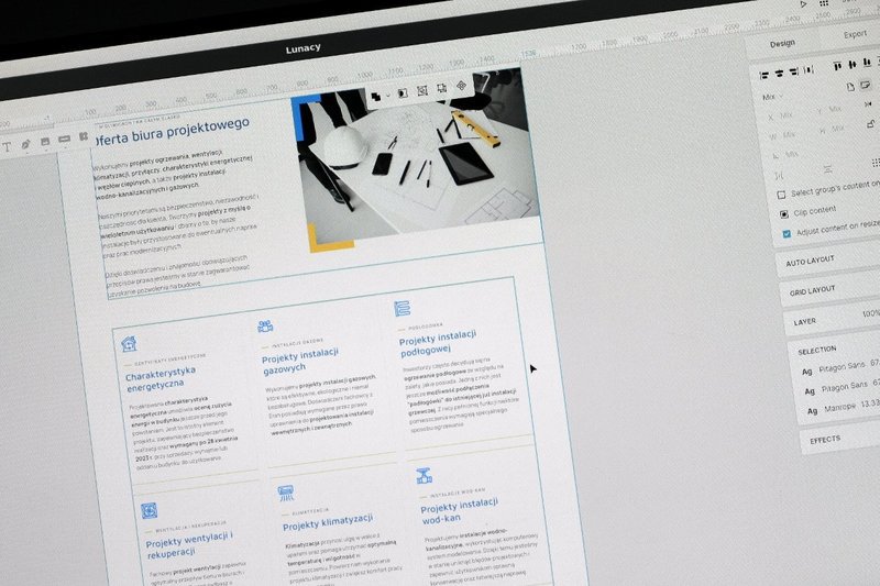 W oparciu o zaakceptowane makiety tworzymy projekt graficzny strony, zgodny z identyfikacją wizualną przedsiębiorstwa. Projekt graficzny nie obejmuje jeszcze składników interaktywnych, jest to statyczny plik graficzny (JPG). Po jego zaaprobowaniu przechodzimy do budowy szablonów HTML/CSS, wykorzystując najnowocześniejsze technologie, takie jak CSS Grid, co umożliwia nam na bieżąco stosowanie nowoczesnych technologii.